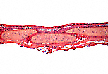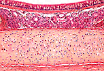 | 气管腔由透明软骨组织构成的软骨环支撑,保持开放状态。在这一纵向切开的气管壁切片上,软骨环的切面呈椭圆形。软骨作为结缔组织,其胶原纤维(即细胞外基质)被苏木精-伊红-固绿(HES)染色法中的番红染成黄色。 | |