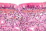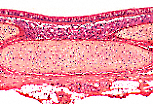 这一放大视图显示,气管内壁的上皮为假复层纤毛上皮,其中含有大量杯状细胞。结缔组织中可见气管的管泡状浆液粘液性腺。 |