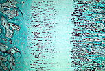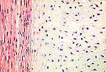 软骨膜的内层(生发层)细胞更丰富。在此区域,合成以I型胶原为基础的细胞外基质的成纤维细胞发生化生,转变为 成软骨细胞 ——这是一种卵圆形细胞,细胞核更大、染色更浅,可合成以II型胶原为基础的细胞外基质。当成软骨细胞被包埋入细胞外基质(其中胶原纤维逐渐融入基质)后,便成为软骨细胞。因此,外加性生长依赖化生过程——即一种组织(结缔组织)转化为形态和功能不同的另一种组织(此处为软骨组织)。 |