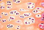 软骨细胞保留有丝分裂能力,这便是内积性生长。胞质分裂后,每个子细胞会分泌细胞外基质, 这些基质逐渐将子细胞彼此分隔,最终每个细胞占据各自的软骨陷窝。来源于同一母细胞的软骨细胞形成同源细胞群:若细胞呈冠状排列,该同源细胞群称为冠状同源细胞群(使软骨块体积增大);若细胞呈线状排列,则称为轴向同源细胞群(使软骨块长度增加)。 |