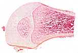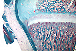 这一生长中长骨末端切片显示,在骨骺与骨干的连接处,有一层颜色更浅的软骨组织,即生长板(骺软骨)。 |