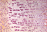 远离有丝分裂增殖区的软骨细胞会发生肥大并退化,其软骨陷窝扩张。生长板的骨干侧(本图右侧)被破软骨细胞吸收,这一破坏过程发生在名为侵蚀线的区域。 |