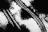 透射电镜(MET)下,经负染色后,I型胶原纤维呈现明暗相间的横纹结构。这种横纹是由构成纤维的原纤维中胶原分子规律性错位排列所致。 |