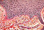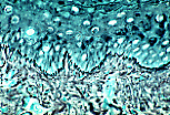 皮肤中分隔表皮和真皮的表皮-真皮连接处的基膜呈PAS阳性。基膜表现为勾勒上皮组织的品红色线条,这种PAS阳性染色是由于基膜区域集中分布的硫酸乙酰肝素(一种蛋白聚糖)所致。 |