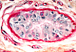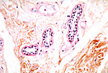 所有基膜均呈PAS阳性。例如:血管内皮下方的基膜(本图中为毛细血管),以及包绕外泌汗腺分泌单位的基膜。 |