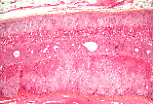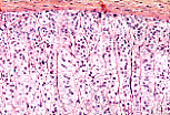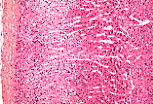 此图显示肾上腺皮质的三个亚区(从外周向深部):薄且染色深的球状带、染色最浅的束状带、以及嗜酸性最强的网状带。