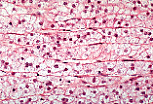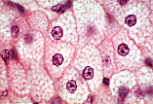 这类细胞利用储存的非融合性脂质小滴中的胆固醇合成类固醇激素。在石蜡包埋过程中,脂质被溶解,使细胞呈现海绵样外观。细胞的细胞核位于中央,胞质内的纤细网状结构勾勒出已溶解的脂滴位置。