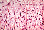 血窦毛细血管的管腔常被挤压变窄(毛细血管被"夹"在两条细胞索之间)。通常只能通过内皮细胞的长梭形细胞核来识别毛细血管的位置——这些细胞核标记出两条腺细胞索的边界。