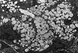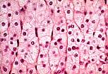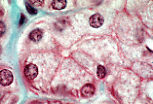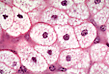 光镜下,这些细胞呈海绵状,因此被称为海绵细胞。细胞中央有细胞核,纤细的胞质网架勾勒出脂滴的位置(脂滴内容物在石蜡包埋过程中被提取)。 |