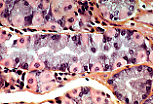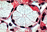 胃底腺的壁细胞(又称泌酸细胞/旁细胞)为锥体形,强嗜酸性,可分泌盐酸。胞质内大量线粒体与细胞膜内褶共同作用,是其呈现嗜酸性染色的原因。 |