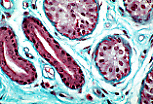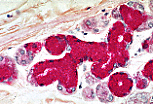PAS染色可将黏液性腺细胞的黏原颗粒着色。 |