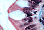 该切片显示已将全部黏原颗粒分泌完毕的杯状细胞顶端。 |