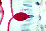 光镜下,该细胞呈杯状:狭窄的基底部可见深染的三角形细胞核,而细胞顶端则充满黏原颗粒。 |