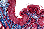 PAS染色可显示杯状细胞的黏原颗粒,同时也能显示糖萼(尤其在吸收细胞纹状缘处高度发达)以及基膜中的蛋白聚糖。 |