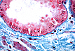 光镜下,黏液性腺细胞的特征为:细胞核被挤压至基底部、顶端区域充满着色浅的黏原颗粒。 |