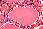 甲状腺由滤泡(囊泡)构成。合成甲状腺激素的腺细胞高度随细胞活性变化:细胞相对不活跃时呈扁平状;合成前激素并分泌至滤泡中央腔时变为立方形;最终呈柱状时,会重吸收前激素、将其转化为活性激素并分泌至血管中。 |