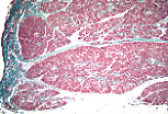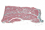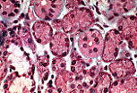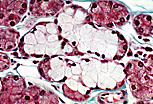 图像中央为被詹努齐浆液新月覆盖的黏液性管泡腺;图像周边为浆液性腺泡。柱状的黏液性腺细胞(顶端闭合型)细胞核被挤压至基底部,胞质顶端充满着色浅的黏原颗粒;浆液性腺泡的细胞则具有位于基底部的圆形细胞核、嗜碱性的基底部及嗜酸性的酶原颗粒。