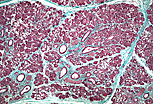 在占主导地位的浆液性腺泡分泌单位中,可见少量混合性分泌单位(其黏液细胞着色浅)。在此放大倍数下,小叶间结缔组织隔内的大管径排泄管(集合管)已清晰可见。