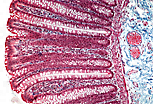 胃底腺的分泌单位符合这一形态特征。 该腺体的管壁中可观察到两种腺细胞:嗜酸性的壁细胞(分泌盐酸)和基底部嗜碱性的主细胞(分泌酶原)。 |