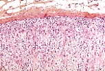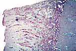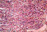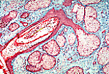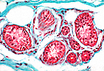 外泌汗腺的分泌单位(外泌汗腺管)就是典型的例子。 由于其盘绕形态,该导管在本切片中被多次切割,呈现出不同的切面形态。 管壁由柱状、略呈嗜酸性的腺细胞构成,这些细胞分泌汗液。 腺细胞基底部下方可见肌上皮细胞。 |