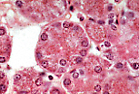例如,这是唾液腺的浆液性腺泡。 该腺泡的腺细胞分泌酶原,可通过其嗜碱性的基底部、圆形的细胞核以及位于顶部的嗜酸性酶原颗粒识别。 |