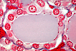 在本切片中,可观察到一个合成降钙素的透明细胞(C细胞)散在于合成甲状腺激素的甲状腺滤泡上皮细胞之间。 |