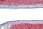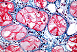 | 对同一切片进行三色染色(trichrome)后,可观察到相同的细胞特征: 体积大、细胞质富含糖原、肌原纤维分布于细胞周边。 | |