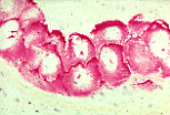| 过碘酸-希夫染色(PAS) 证实了糖原的存在; 由于人工伪影(artefact),糖原主要分布于心脏传导细胞的周边区域。 | |