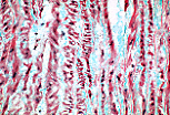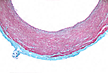 | 大口径动脉管壁的横切面可见圆形管腔,管腔内侧衬有内皮细胞。 内皮外侧是一层较厚的结构,在低倍镜下呈嗜酸性。 分支型平滑肌细胞就位于这一被称为中膜(media)的结构中。 中膜的外侧由结缔组织包绕。 | |