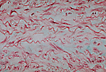 | 另一视野可见形态明显呈波浪状的弹性膜,其下方为分支型平滑肌细胞。 分支型平滑肌细胞之间的间隙由少量结缔组织填充,在该三色染色切片中,结缔组织中的胶原纤维被淡绿(vert lumièr e)染成绿色。 | |