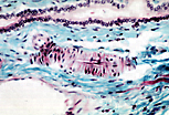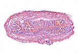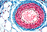 该动脉壁的中膜由梭形平滑肌细胞构成的同心层组成。 如本视野所示,动脉横切时,平滑肌细胞呈纵切状态。 中膜内侧为内皮细胞(位于基膜上)和波形弹性膜; 外侧由致密结缔组织层与周围组织明确分界。 |