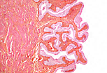 | 空虚的膀胱中,尿路上皮覆盖的固有层呈皱缩状。 肌层由平滑肌细胞构成,这些细胞聚集成束,呈纵行或横行排列。 | |