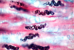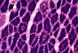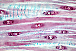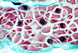 纵切面(CL)下,平滑肌细胞细长呈梭形,但通常比横纹肌细胞短。 嗜酸性的细胞质中含有一个长形细胞核,位于中央的肌浆区(fuseau sarcoplasmique)内。 这些细胞平行于肌束长轴排列,彼此间间隙极小: 细胞相互交错嵌合,一个细胞的膨大部与相邻细胞的尖端相邻。 每个细胞均被 网状纤维 网包裹,即透明鞘(manchon pellucide)。 |