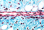 此小口径动脉纵切后,其肌层仅含单层平滑肌细胞; 内侧为内皮细胞,仅可见其沿血流方向排列的长形细胞核。 肌层厚度不均一,与平滑肌细胞横切面的随机位置有关。 |