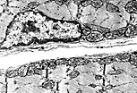 该视野显示:细胞质(肌浆/sarcoplasme)包含聚集成肌原纤维的肌丝,以及位于骨骼肌(横纹肌)细胞周边的细胞器(线粒体)。 电子密度最高的Z线将每个肌原纤维分割为首尾相连的微小收缩单位——肌节。 骨骼肌(横纹肌)细胞由细胞膜和其外侧的基膜共同界定; 细胞膜、细胞外被和基膜共同构成肌膜(sarcolemme)。 肌膜外侧可见肌内膜的胶原纤维(纵切和横切形态)。 |