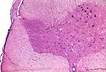 脊髓是位于脊柱中央椎管内的神经组织圆柱。横切面上可见两部分:外周染色较浅的白质,以及中央呈蝴蝶形、染色较深的灰质。灰质以室管膜管为中心,脑脊液在管内循环。 |