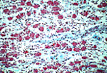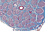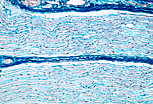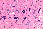神经节细胞 的胞体(核周体)浸润于结缔组织基质中,基质内有大量传入或传出神经纤维穿行(这些纤维源自神经节细胞或仅穿过神经节)。轴索表现为嗜酸性“细丝”束,彼此间由少量结缔组织分隔。这些纤维多为施万细胞性无髓神经纤维。 |