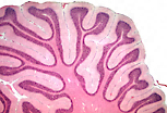分子层主要由神经细胞突起构成,包含相对少量的神经元胞体(核周体)和胶质细胞。相反,颗粒层细胞密集,因此富含小神经元胞体(核周体)和胶质细胞的细胞核(即“颗粒”)。颗粒层下方是包含有髓神经纤维的白质。 |