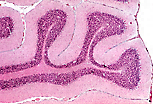 小脑皮质的灰质分为两层:外层嗜酸性的分子层,以及内层嗜碱性的颗粒层(粒层)。 |