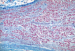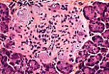 胰腺壁内的副交感神经节。神经节细胞可通过以下特征识别:大细胞核、染色质弥散、核仁清晰可见,且胞质丰富(含尼氏小体)呈嗜碱性。周围神经胶质细胞中的神经节卫星细胞紧密贴附于其表面。神经节细胞与神经纤维相互交织。 |