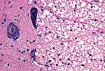 横切(CT)下,施万细胞性有髓神经纤维呈靶心状:中央或偏心位的轴索、髓鞘溶解后形成的白色环、外周嗜酸性的施万细胞质环。施万细胞性无髓神经纤维表现为嗜酸性小点簇(轴索)。细胞核属于施万细胞,或可能为包裹每根神经纤维的神经内膜成纤维细胞。 |