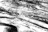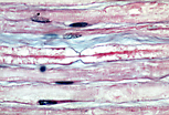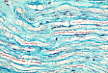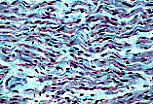 纵切(CL)下,施万细胞性无髓神经纤维表现为一束纤细的轴索,彼此紧密相邻且被伊红染成粉色。每根纤维均被少量结缔组织(神经内膜)包裹。穿行于这些神经纤维中的细胞核属于施万细胞,或可能为神经内膜的成纤维细胞。 |