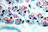 纵切(CL)的施万细胞性有髓神经纤维中,轴索作为胞质突起被伊红染成粉色,孤立于白色区域(髓鞘)中央。髓鞘由施万细胞膜缠绕形成,主要成分为磷脂(在石蜡包埋时溶解)和蛋白质;脂质提取后蛋白质结构紊乱,沉淀形成粉色网格状结构,即神经角蛋白网。髓鞘周边的细胞核属于施万细胞,或可能为神经内膜的成纤维细胞。 |