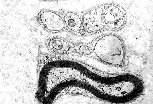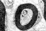电镜(MET)下,施万细胞性无髓神经纤维的横切显示:施万细胞膜内陷形成凹陷以容纳轴索;这些轴索仅嵌入施万细胞胞质中,因此被施万细胞膜和胞质包裹。细胞膜(通过外蛋白层)贴合封闭形成的凹陷称为轴系膜(mésaxone)。 |