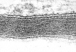 此高倍视图显示致密髓鞘层内无施万细胞质。深色线条为周期性致密线(由胞质膜层贴合形成);这些线条间可见更纤细的内周期间致密线(代表贴合的外膜层)。 |