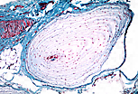 | 环层小体(帕奇尼小体)是体积较大的被囊型感受器,可感受压力、振动和张力刺激,主要分布于皮肤深层(真皮与皮下组织之间)。每个环层小体由中央的无髓树突构成核心,外包厚层 板层状结缔组织 被囊,该被囊中胶原纤维与成纤维细胞交替排列。 | |