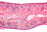 注意表面的假复层纤毛柱状呼吸上皮(纤毛细胞和杯状细胞)、大量小腺体(外分泌腺,复管泡状,浆液粘液性,局浆分泌型),以及丰富的厚壁血管(动脉)——其平滑肌构成的肌层发育良好。