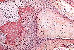 骨针(编织骨)形态不规则,而软骨小结节形态规则。与骨细胞不同,软骨细胞保留有丝分裂能力,因此软骨组织内可见同源细胞群。成骨细胞以上皮样排列方式分布于骨小梁周围;骨组织的细胞外基质染色强度远高于软骨组织的细胞外基质。