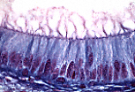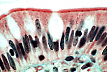 在小肠处,单层柱状被覆上皮主要由纹状缘柱状细胞(肠上皮细胞)构成,这类细胞的游离面(顶端)具有微绒毛结构。 |