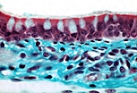| 呼吸系统的假复层被覆上皮中,纤毛细胞的游离面(顶端)分布有纤毛(摆动纤毛)结构。 . | |
